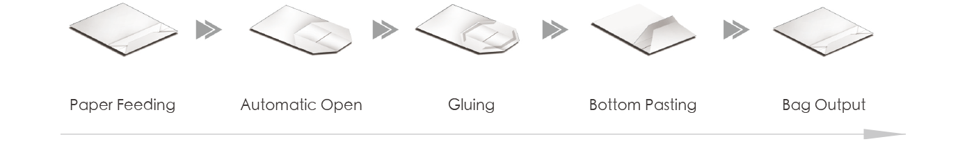 The basic working flow of this machine is automatic feeding the unclosed-bottom paper bag, bottom opening, bottom cardboard inserting, two times positioning, coated water base (or spray gluing), bottom closing and compaction output the paper bag.